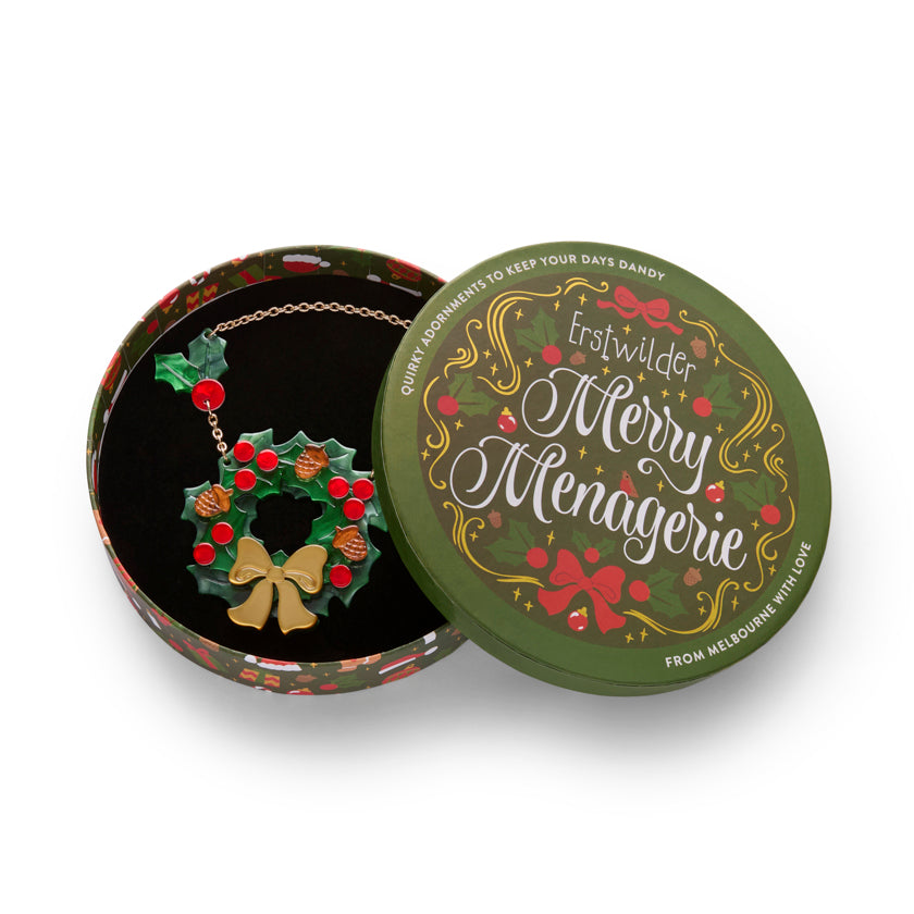 A classic symbol reimagined in lush green resin, the Forest Wreath necklace shines with acorn and berry detailing, complemented by a golden bow. Sophisticated yet playful, this stunning statement necklace...
